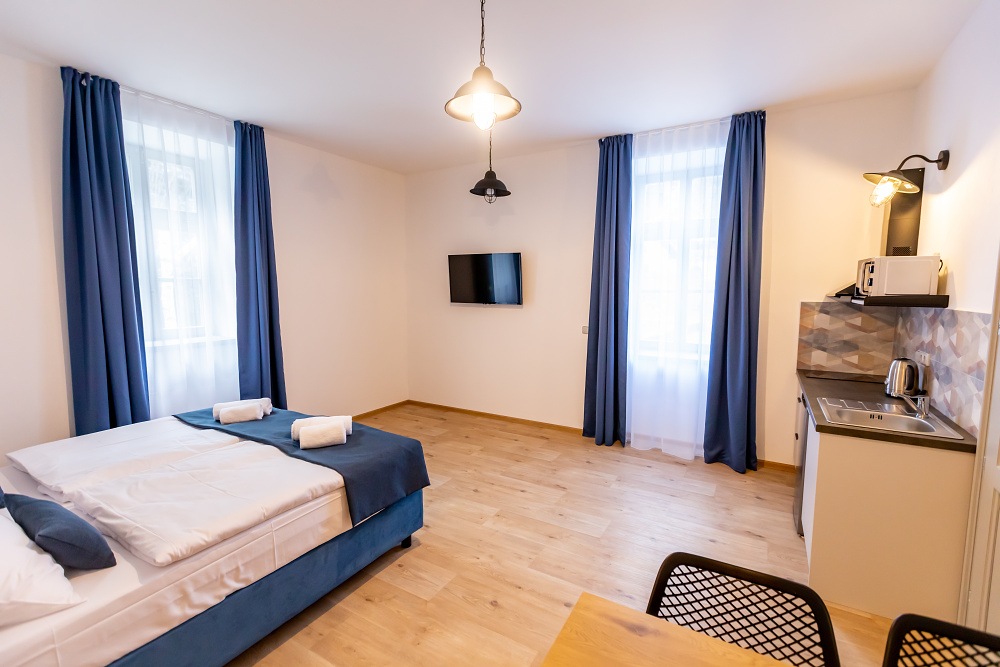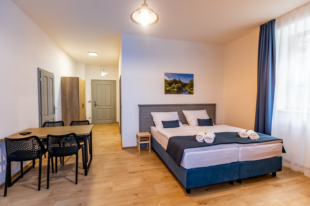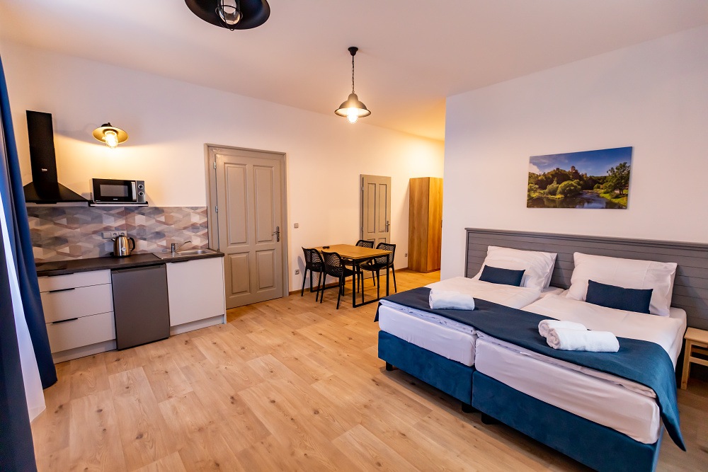 Pro rodiny nebo přátele jsou připraveny 4 lůžkové apartmány s kuchyňskou linkou a venkovním posezením. Na pohodový a klidný spánek tu máme boxspringové postele. V koupelně pak naleznete kosmetiku Nature Touch.