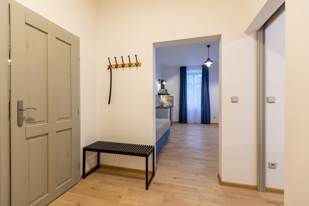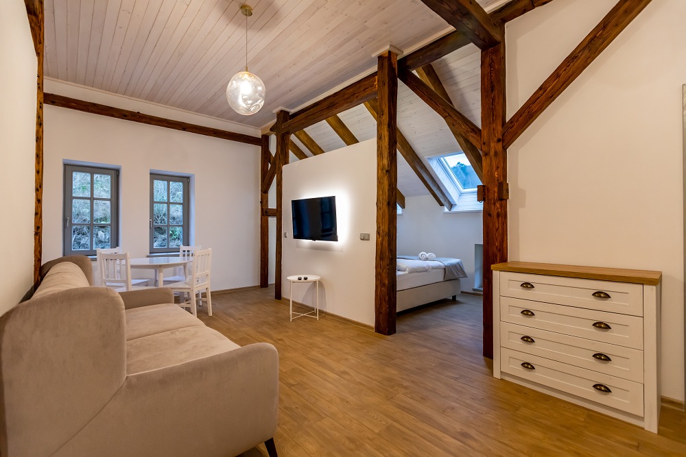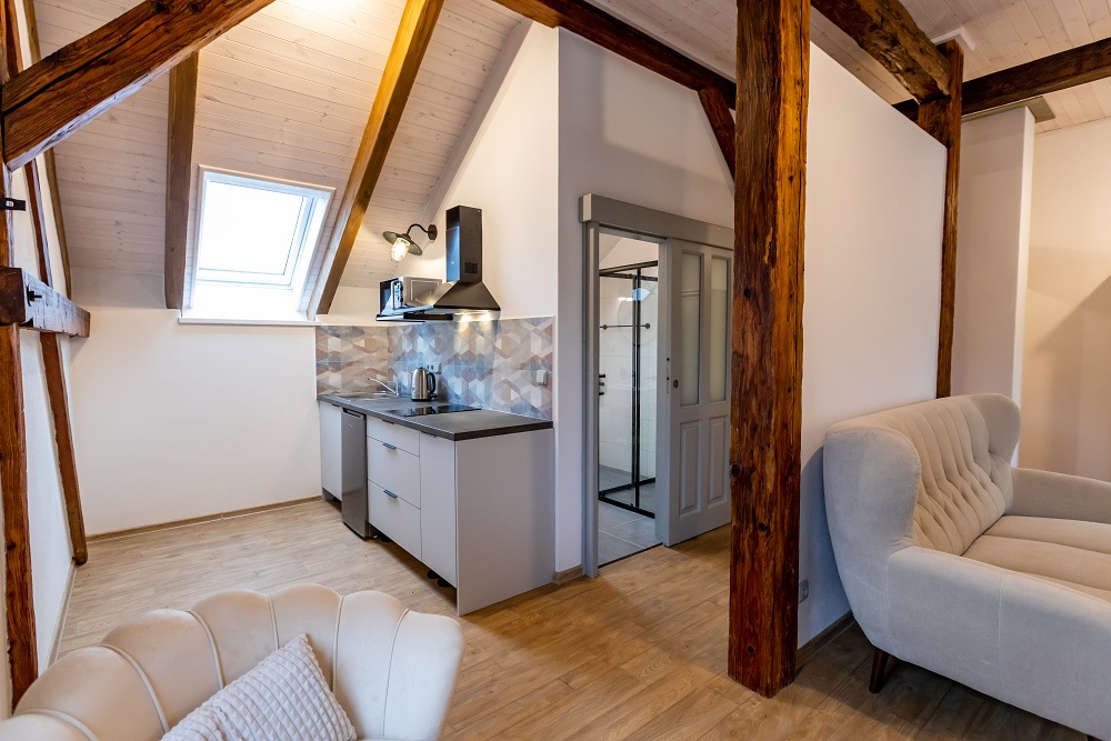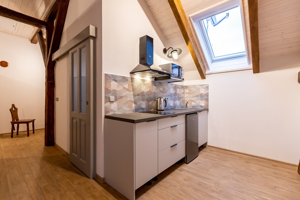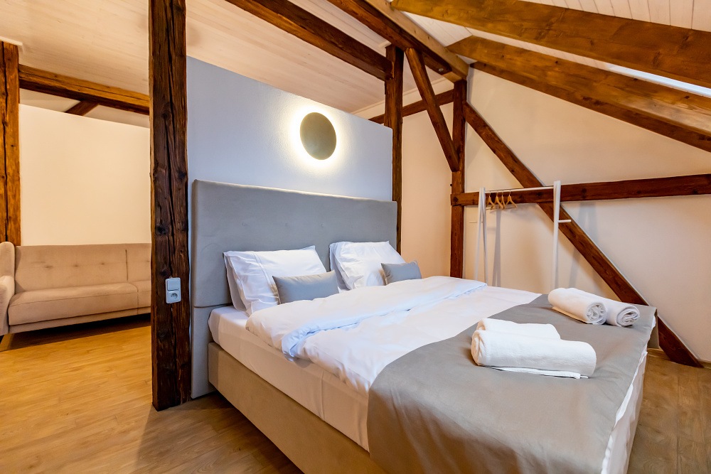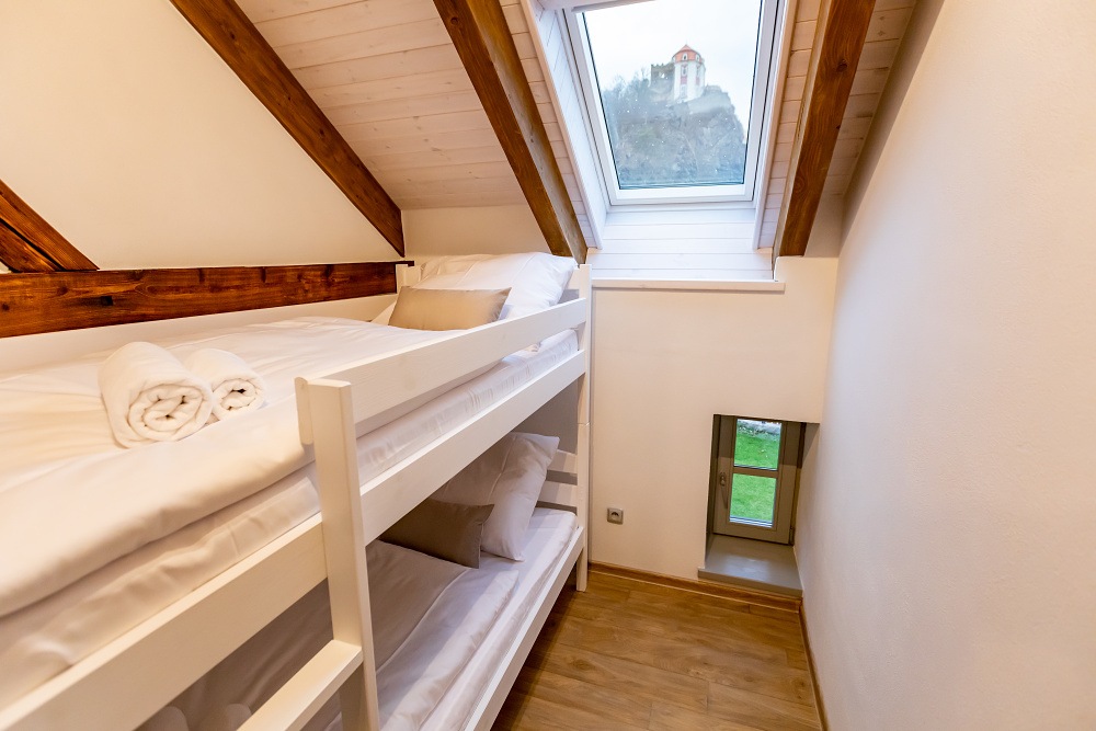 4 lůžkové rodinné apartmá č.8 s patrovou postelí, kuchyňkou, a posezením na centrální terase s výhledem na Vranovský zámek. Na pohodový a klidný spánek tu máme boxspringové postele. V koupelně pak naleznete kosmetiku Nature Touch.