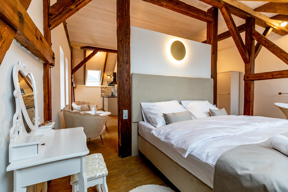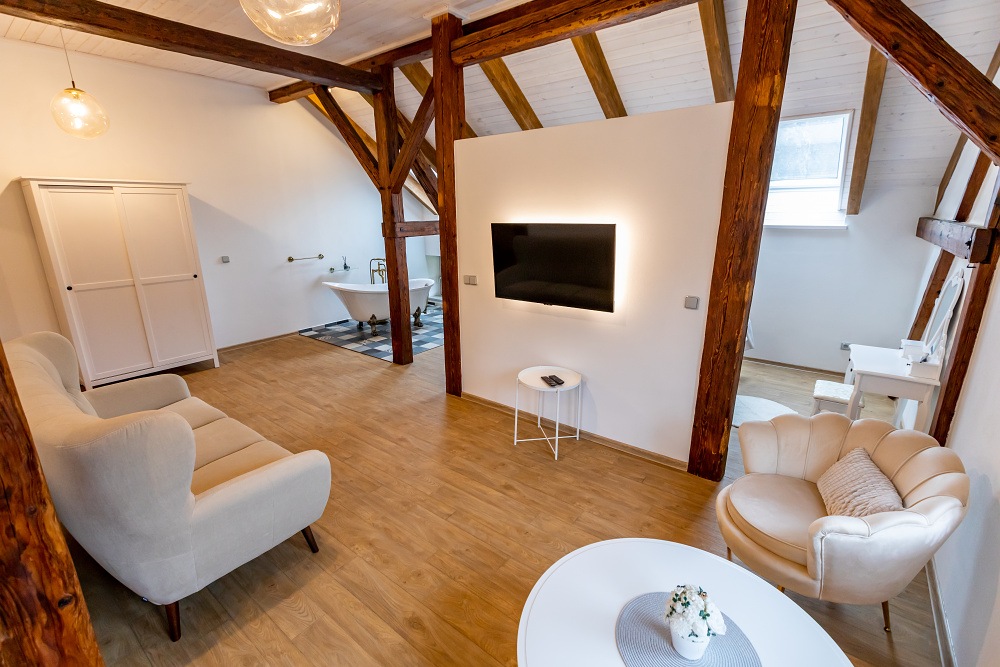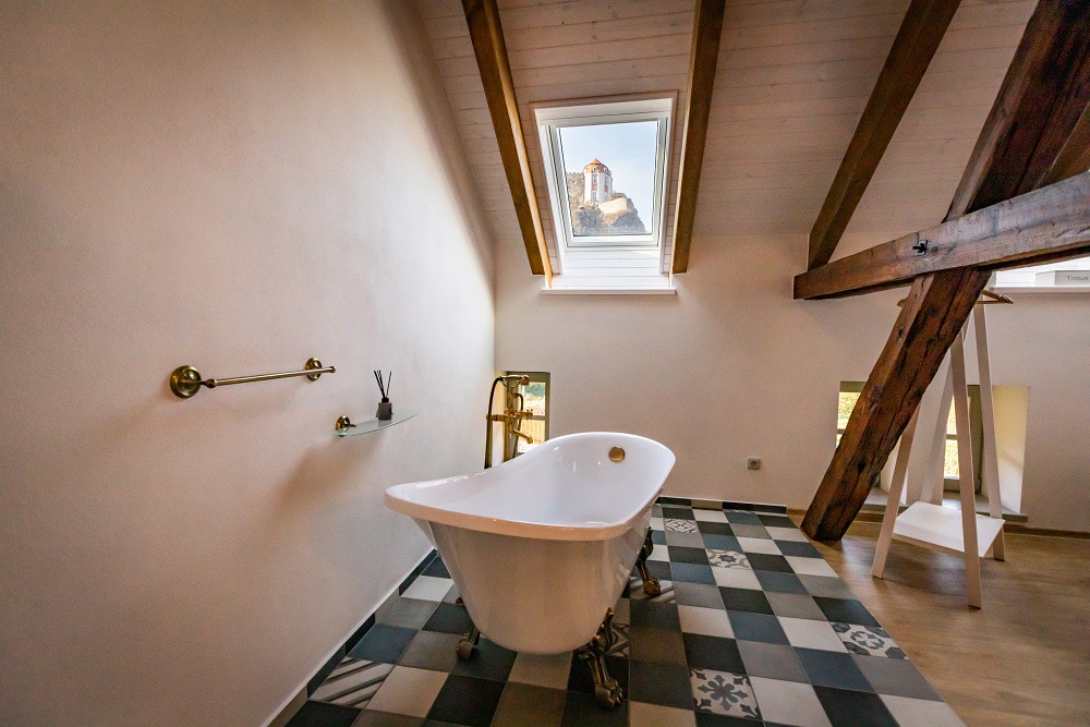 Pro novomanžele je připraveno úžasné svatební apartmá č.7 s jedinečnou samostatně stojící vanou s nádherným výhledem na kouzelný vranovský zámek. Nevěsty také jistě ocení kosmetický stolek se zrcadlem, u kterého mohou probíhat svatební přípravy.
